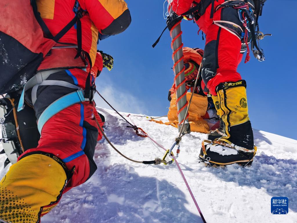 5月4日,在珠穆朗瑪峰峰頂,科考隊員在采集冰雪樣品。新華社特約記者 索朗多吉 攝
