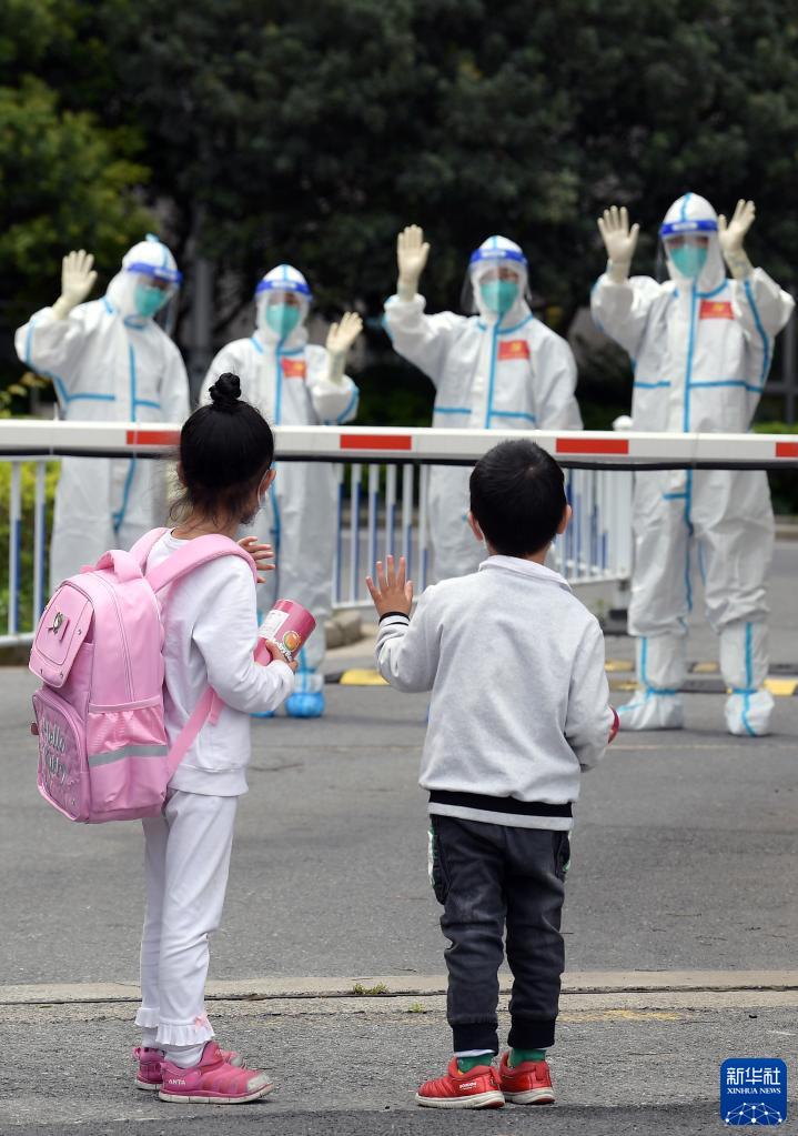 4月30日,走出醫(yī)院準備回家時,小華(右)和姐姐回身向護送他們出院的醫(yī)護人員揮手道別。當日,由上海交通大學醫(yī)學院附屬仁濟醫(yī)院南部院區(qū)(新冠定點醫(yī)院)收治的3歲重癥新冠患者小華(化名)出院。新華社記者 李賀 攝