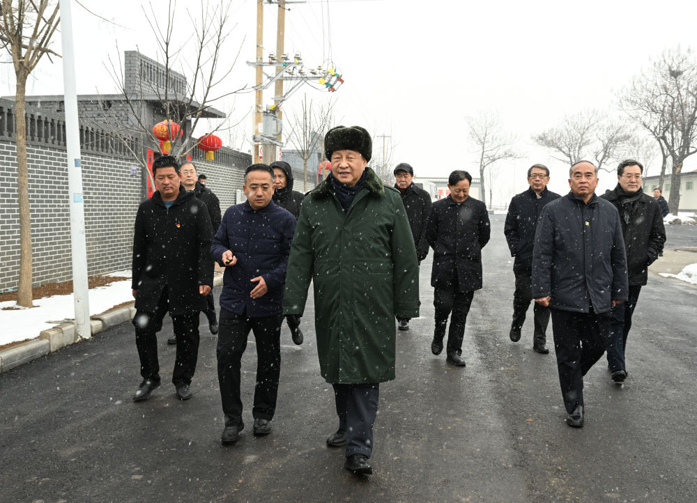 ↑2022年1月26日下午,習(xí)近平冒雪在山西省臨汾市霍州市師莊鄉(xiāng)馮南垣村考察。