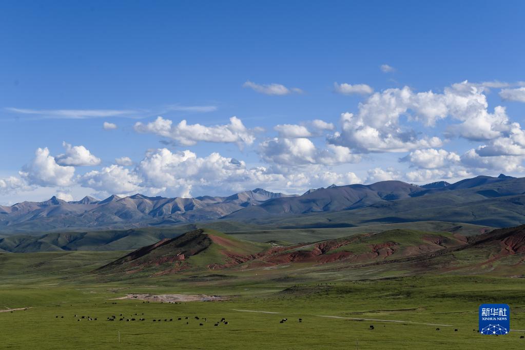 2021年7月23日,在青海省玉樹藏族自治州境內(nèi)的草原上,牦牛在覓食。新華社記者 張龍 攝