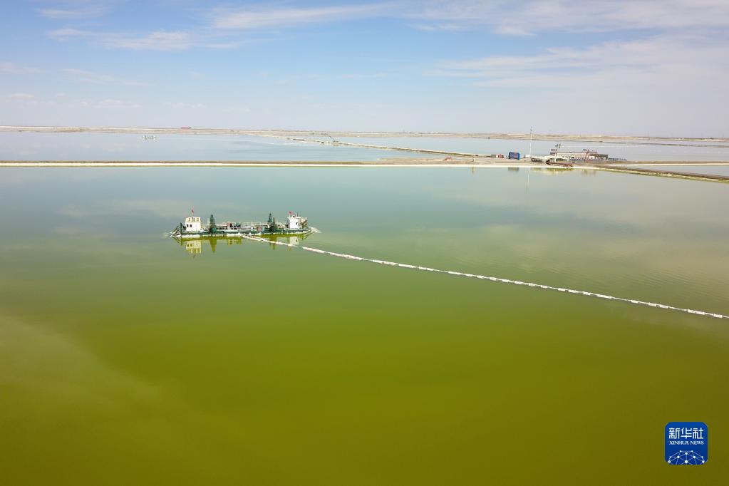 這是2022年6月13日在青海柴達(dá)木盆地拍攝的察爾汗鹽湖上的采鹽船(無(wú)人機(jī)照片)。新華社記者 范培珅 攝