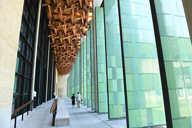 中國國家版本館杭州分館屋頂?shù)哪緲?gòu)和青瓷門扇相映成趣