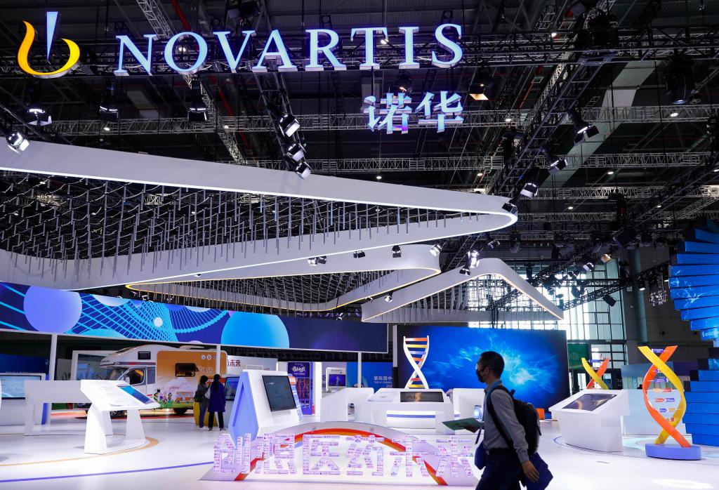 這是2021年11月9日拍攝的進(jìn)博會(huì)醫(yī)療器械及醫(yī)藥保健展區(qū)的瑞士諾華展臺(tái)。(新華社記者 張玉薇 攝)
