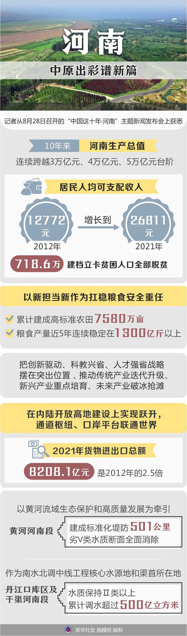10年來,河南生產總值連續(xù)跨越3萬億元、4萬億元、5萬億元臺階,居民人均可支配收入從2012年的12772元增長到2021年的26811元,718.6萬建檔立卡貧困人口全部脫貧。