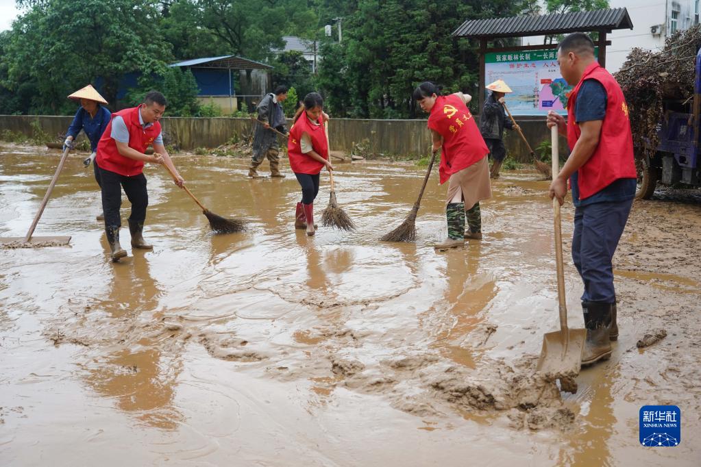 2022年6月21日,在江西省德興市泗洲鎮(zhèn)張家畈社區(qū),黨員干部在清理淤泥和垃圾。新華社記者 周密 攝