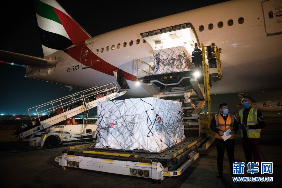 2020年12月10日,在埃及開羅國際機(jī)場,工作人員運(yùn)輸中國研制生產(chǎn)的新冠疫苗。新華社記者鄔惠我攝