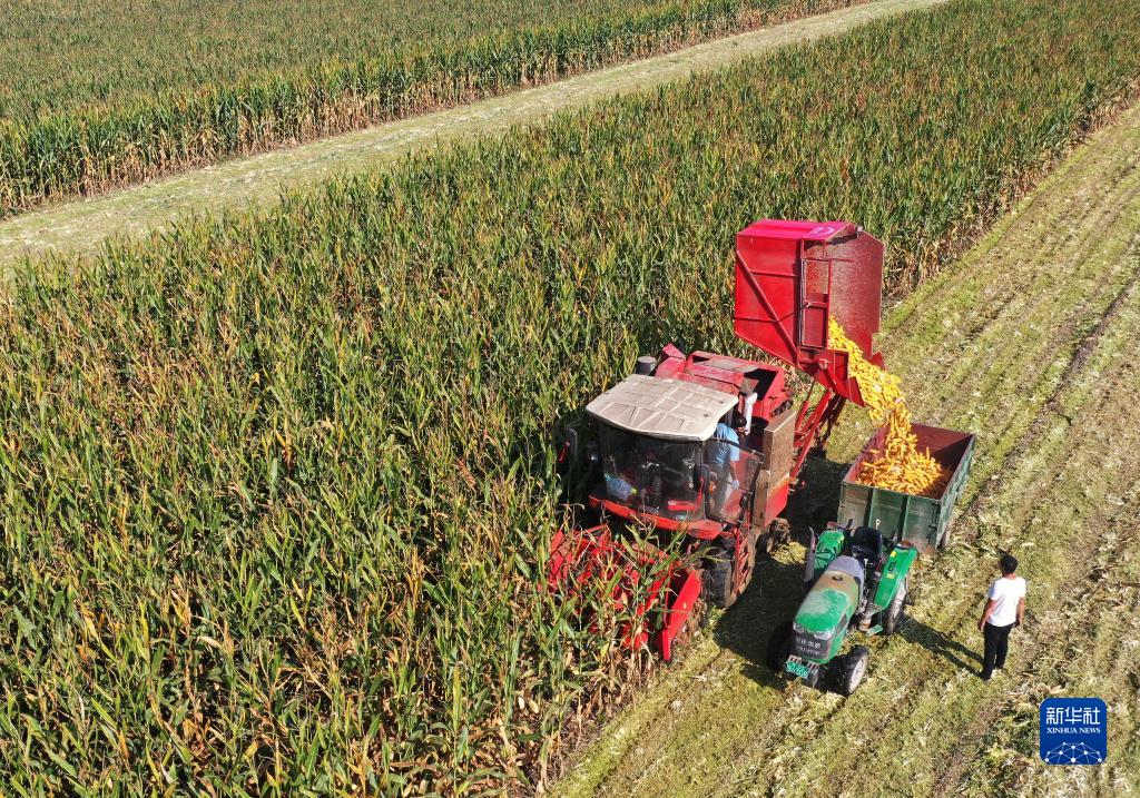 農(nóng)機(jī)手駕駛收割機(jī)在河南省尉氏縣張市鎮(zhèn)沈家村為村民收獲玉米(9月18日攝,無(wú)人機(jī)照片)。新華社記者 李嘉南 攝