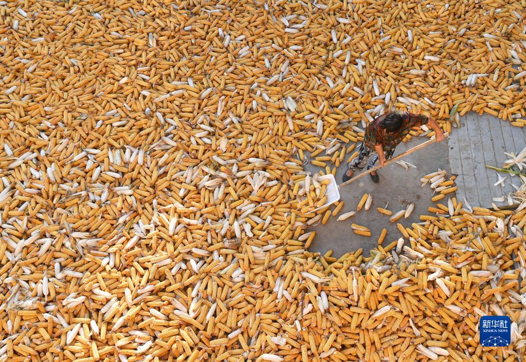 河南省尉氏縣張市鎮(zhèn)沈家村村民將收獲的玉米攤開(kāi)(9月17日攝)。新華社記者 李嘉南 攝