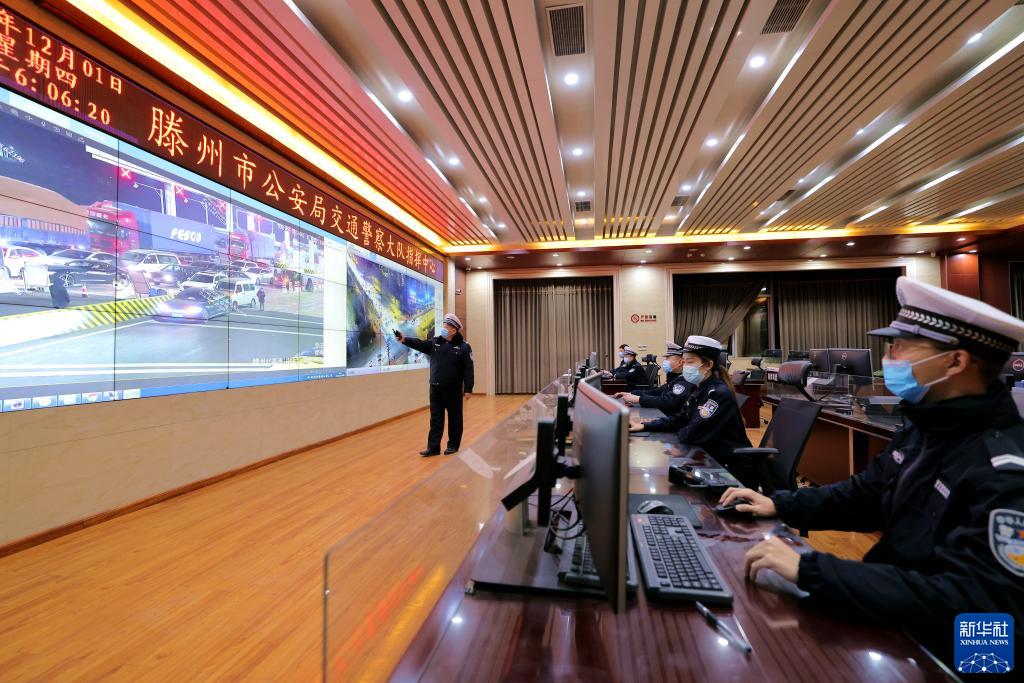 12月1日,在山東省滕州市公安局交警大隊指揮中心,借助“情、指、勤、督”一體化智慧交通管理平臺,民警對各個路口及路段交通流數據進行綜合分析。新華社發(fā)(鐘自增 攝)