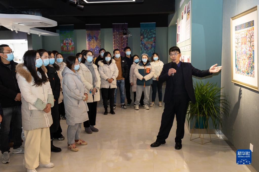 12月4日,江蘇省南京市六合區(qū)農(nóng)民畫美術(shù)館內(nèi),一場(chǎng)以江蘇省非物質(zhì)文化遺產(chǎn)六合農(nóng)民畫為載體的黨的二十大精神宣講會(huì)舉行。這是六合區(qū)冶山街道文體服務(wù)中心主任胡斌(右一)帶領(lǐng)參加活動(dòng)的基層干部群眾參觀農(nóng)民畫。新華社發(fā) (張夢(mèng) 攝