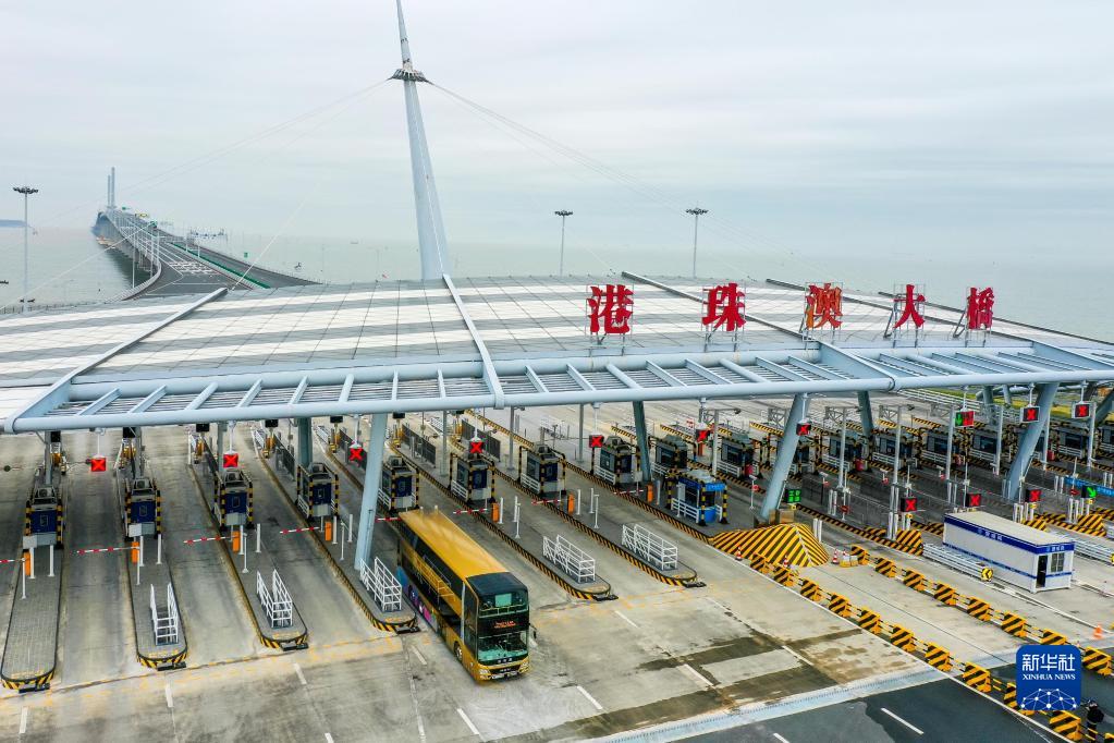 一輛從香港開往珠海的港珠澳大橋穿梭巴士入境珠海(2023年1月8日攝,無人機照片)。新華社記者 劉大偉 攝