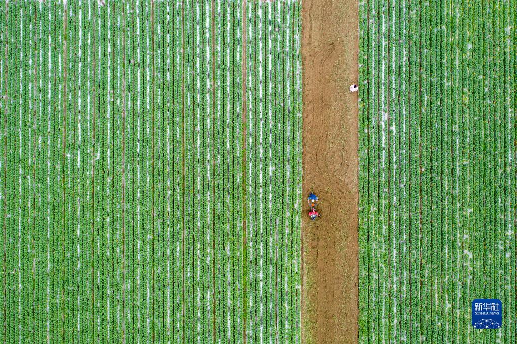 在四川省閬中市彭城鎮(zhèn),村民駕駛農(nóng)機(jī)翻耕菜地(2月23日攝,無(wú)人機(jī)照片)。新華社發(fā)(王玉貴 攝)