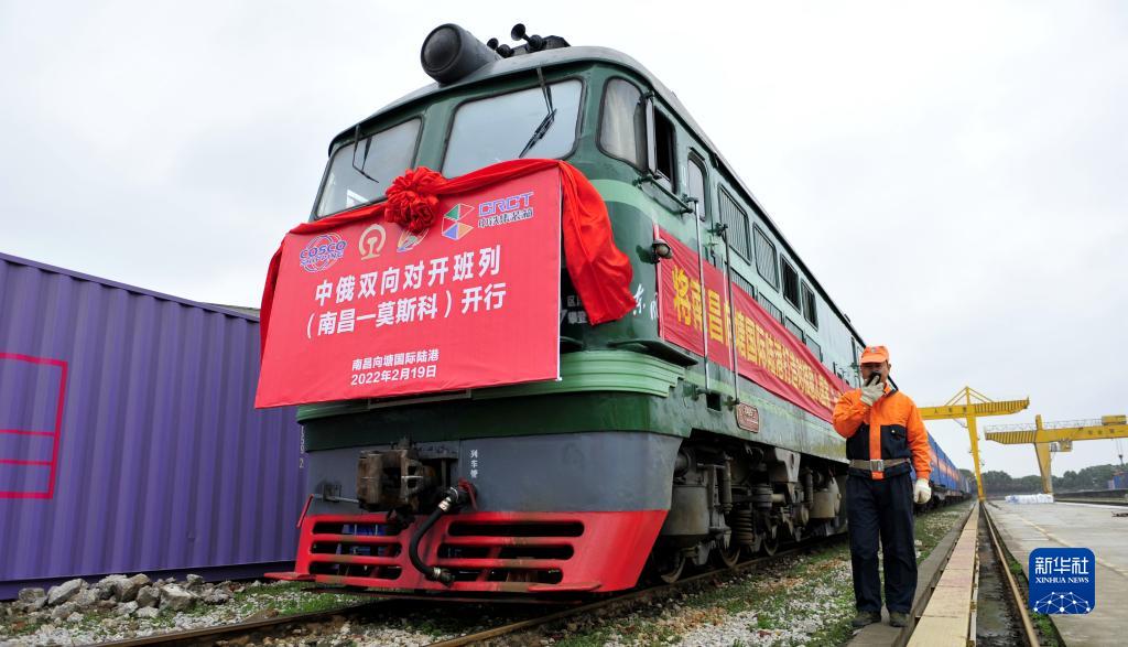 2022年江西首列中俄雙向?qū)﹂_(kāi)班列(南昌—莫斯科)在南昌向塘國(guó)際陸港準(zhǔn)備出發(fā)(2022年2月19日攝)。新華社記者 彭昭之 攝