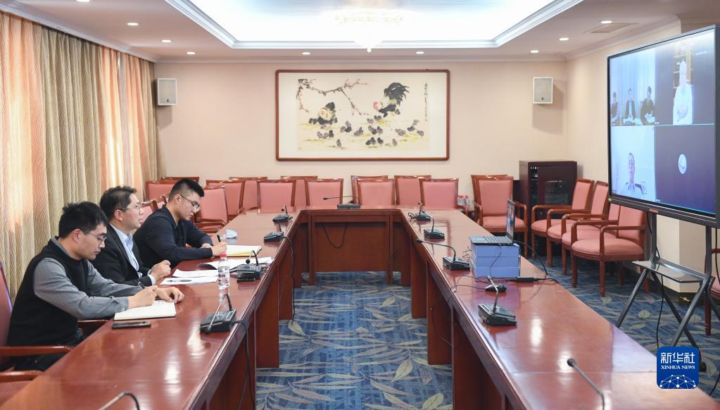 3月8日,科技部成果轉(zhuǎn)化與區(qū)域創(chuàng)新司二級(jí)巡視員陳宏生(左二)和他的兩位同事在科技部與全國(guó)政協(xié)委員隆克平等視頻連線。新華社記者 戴天放 攝