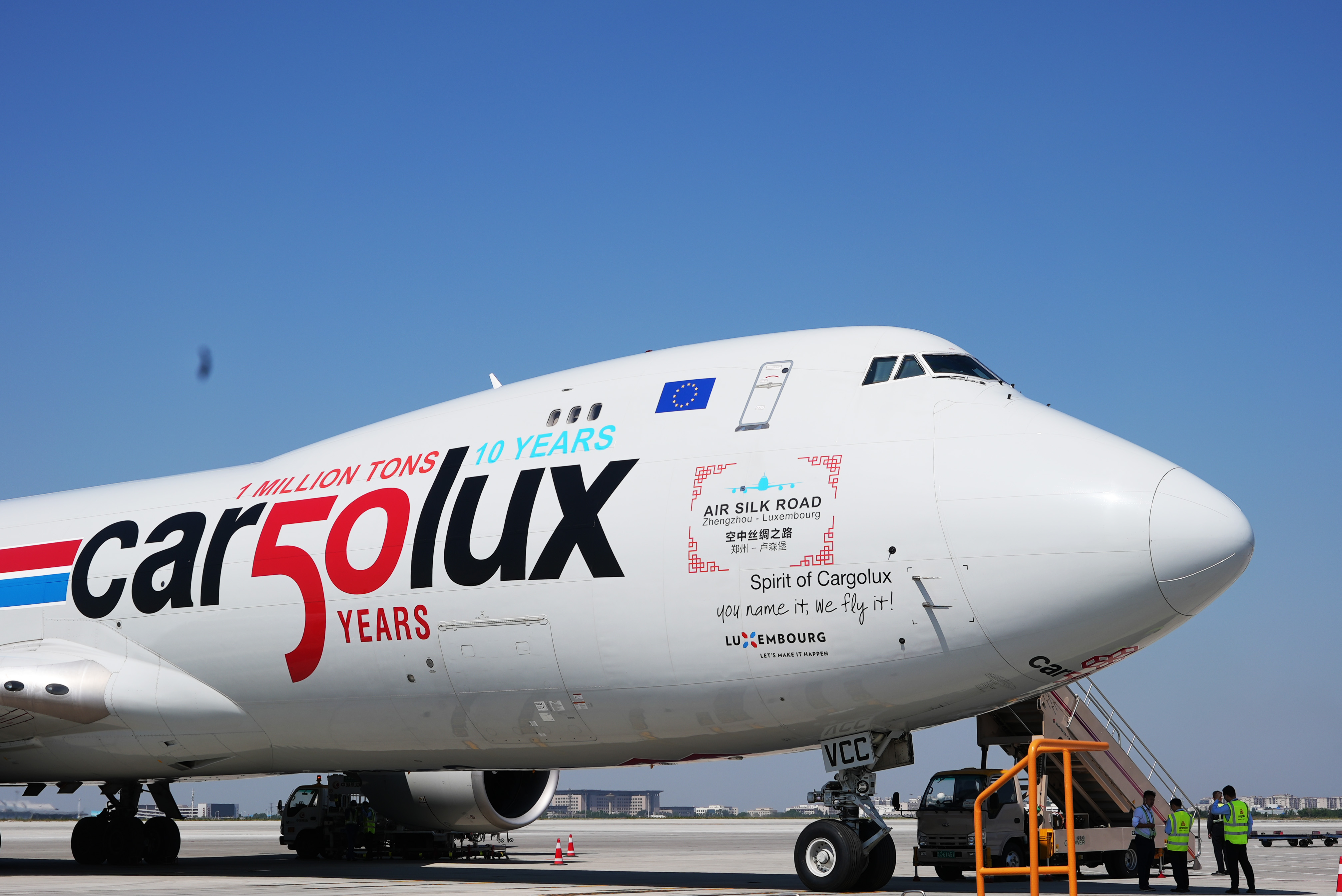 這架被命名“鄭盧空中絲綢之路號”的寬體貨機,編號為LX-VCC?!癦hengzhou-Luxembourg”與“AIRSILKROAD”的英文標識,以疊加式設計炫然機首,配以中國風的紅色邊飾,整體圖案溫婉靚麗。