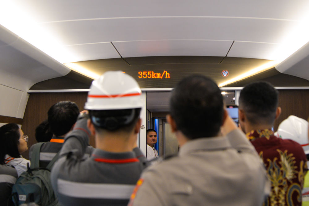 6月22日,印度尼西亞雅萬(wàn)高鐵聯(lián)調(diào)聯(lián)試綜合檢測(cè)列車(chē)運(yùn)行時(shí)速首次達(dá)到350公里。這是記者和工作人員拍攝顯示列車(chē)時(shí)速的電子屏。新華社記者 徐欽 攝