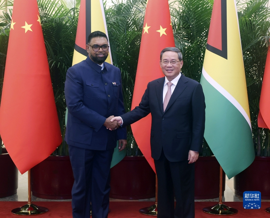 7月30日下午,國務(wù)院總理李強在北京人民大會堂會見來華出席第31屆世界大學(xué)生夏季運動會開幕式并訪華的圭亞那總統(tǒng)阿里。新華社記者 劉衛(wèi)兵 攝