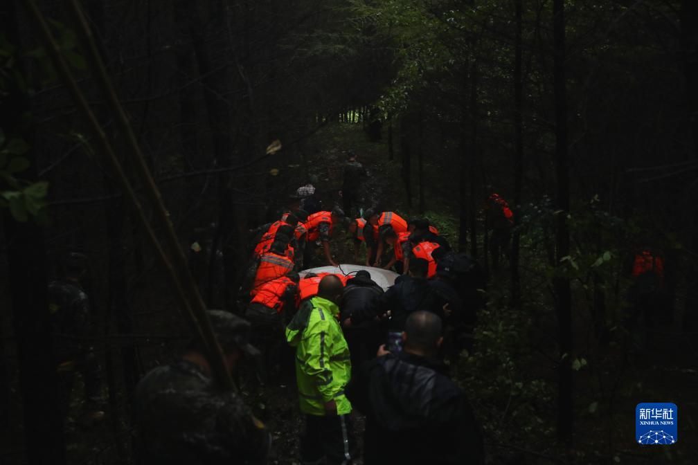 8月7日,武警黑龍江總隊牡丹江支隊官兵正穿過密林準備將沖鋒舟抬至海浪河岸邊。新華社發(fā)(劉飛 攝)
