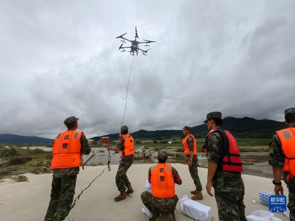 武警吉林總隊吉林支隊官兵利用無人機向舒蘭市開原鎮(zhèn)五滴村小鄉(xiāng)屯90余名被洪水圍困的群眾空投食品和飲用水(8月6日攝)。新華社發(fā)(曹孟澤 攝)