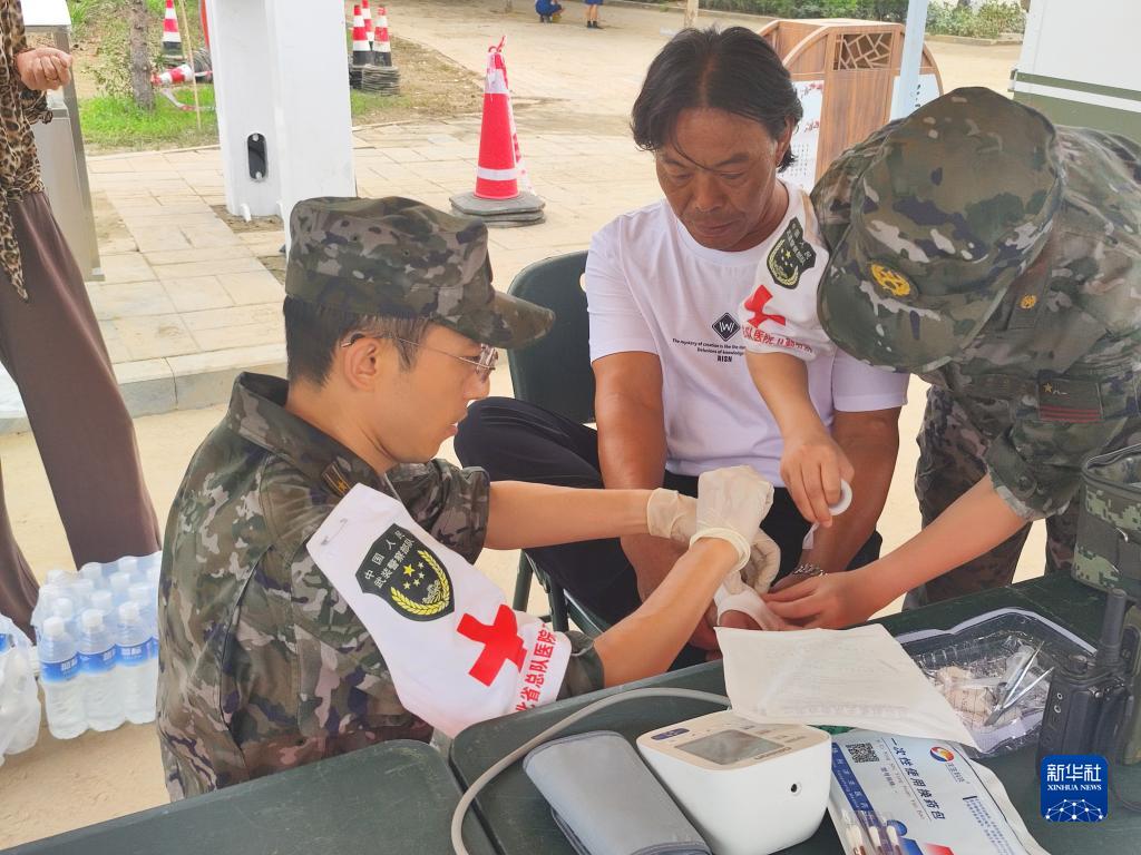 8月7日,武警河北總隊醫(yī)院在涿州范陽東路與騰飛大街開設便民醫(yī)療點,為受災群眾治療腳傷。新華社發(fā)(楊雪乾 攝)