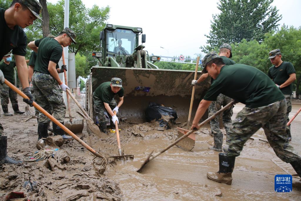8月7日,武警河北總隊機動支隊官兵在涿州朝陽大街搬運垃圾、清淤清泥、沖洗街道。新華社發(fā) (趙佳亮 攝)