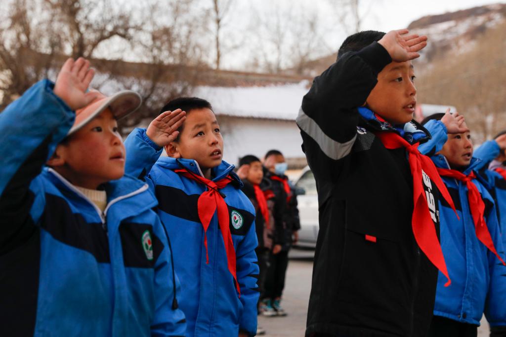 12月25日,積石山縣柳溝鄉(xiāng)陽(yáng)山希望小學(xué)的學(xué)生在復(fù)課首日舉行升旗儀式。 新華社記者 方欣 攝