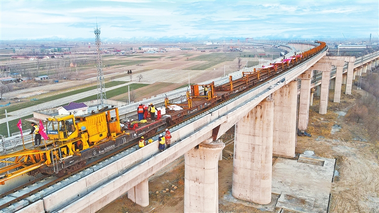 1月24日,中鐵七局施工人員正在進行長軌鋪設(shè)作業(yè)。 本報記者 王錚 攝