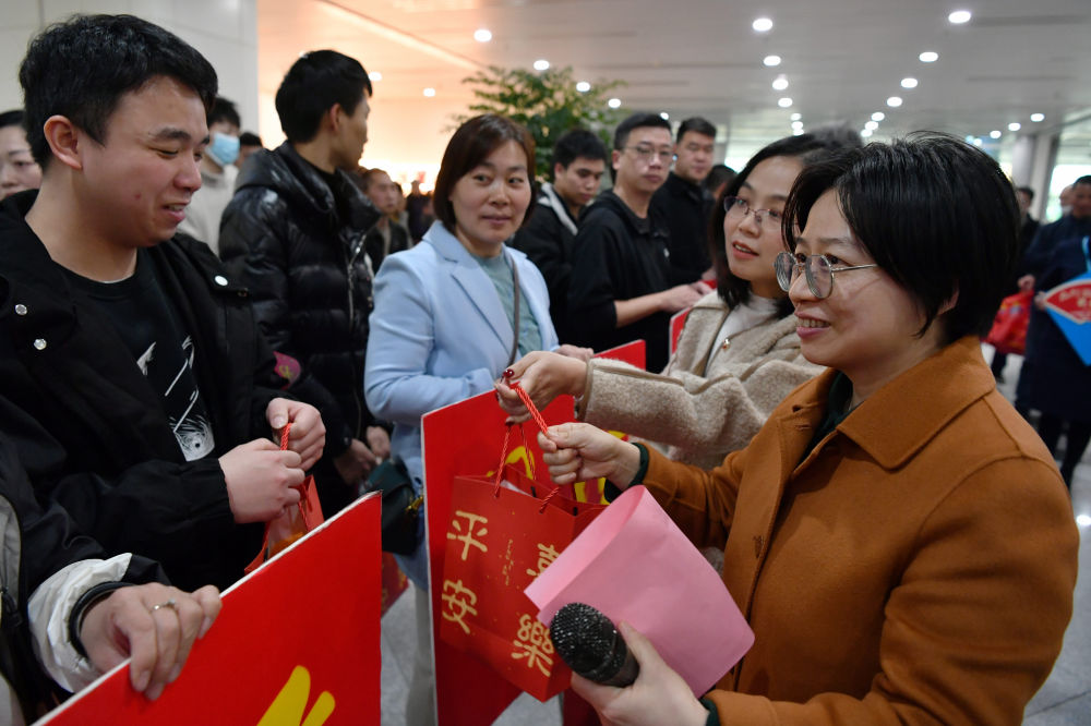 2024年2月15日,福州市人社部門工作人員(前右)向乘坐包機抵榕的返崗務(wù)工人員送上新春大禮包。當日,來自云南、貴州的364名返崗務(wù)工人員乘坐的飛機降落在福州長樂國際機場。這是2024年春節(jié)后福州市人社部門通過免費包機接回的首批重點企業(yè)返崗務(wù)工人員。新華社記者 魏培全 攝