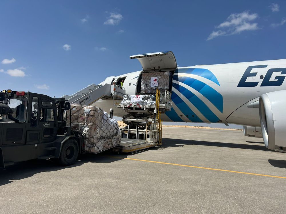 2024年4月19日,工作人員在埃及阿里什機(jī)場卸載中國援助巴勒斯坦的物資。新華社發(fā)