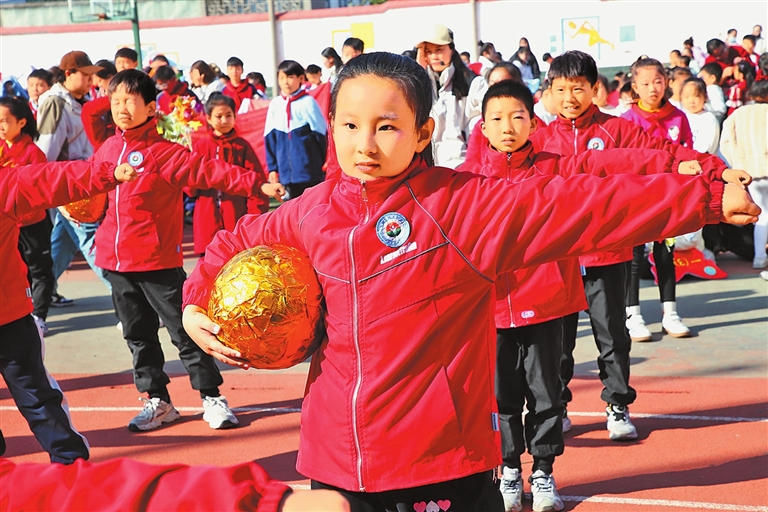 10月24日,焦作市解放區(qū)幸福街小學(xué)學(xué)生正伴隨著音樂(lè)跳自編的韻律操。自秋季新學(xué)期開(kāi)學(xué)以來(lái),該區(qū)開(kāi)展形式多樣、內(nèi)容豐富的特色體育教學(xué)活動(dòng),自編自創(chuàng)體育活動(dòng)項(xiàng)目,讓學(xué)生們通過(guò)別樣的體育活動(dòng)強(qiáng)健體魄。李良貴 攝