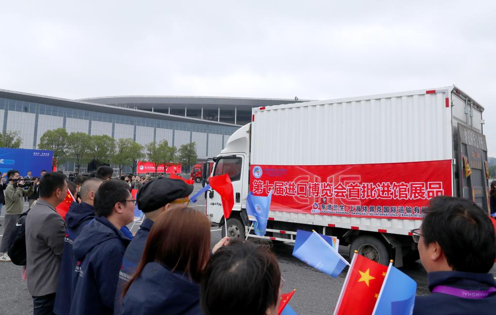 ??10月22日,裝載首批進館展品的卡車駛?cè)雰x式現(xiàn)場。當(dāng)日,第七屆中國國際進口博覽會首批展品進館儀式在國家會展中心(上海)舉行。新華社記者方喆攝